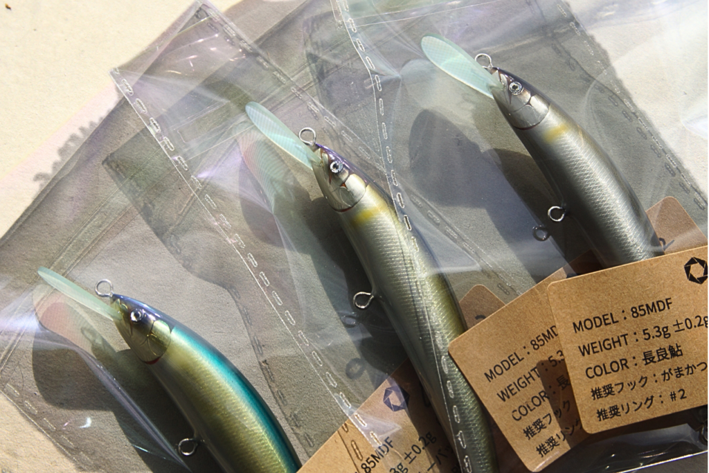 もともとハンドメイドルアーの場合、末端部分のセルロースの乗り具合によって1〜2mm弱の個体差(レングス差)が出るので細かいレングス設定はしないようにしていた(5mm刻みでの表示としていた)のですが、統計的には85mmに近いサイズが多いため、今回から85MDFとして販売しております。
