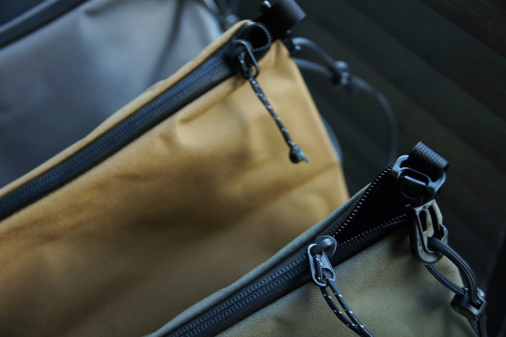 ファスナーはYKKのアクアガード(止水ファスナー)を使用。ショルダーストラップの長さはストッパーで無段階に調整できるようになっています。