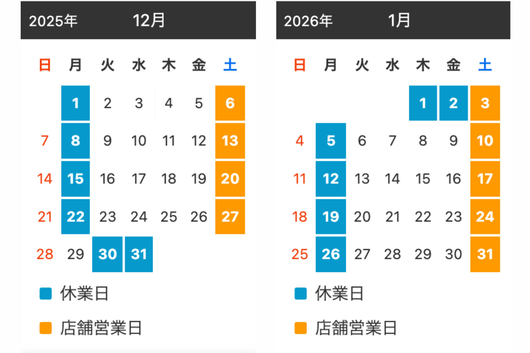 ご来店をご検討されているお客様は店舗営業日カレンダーをご確認の上、ご来店くださいませ。
