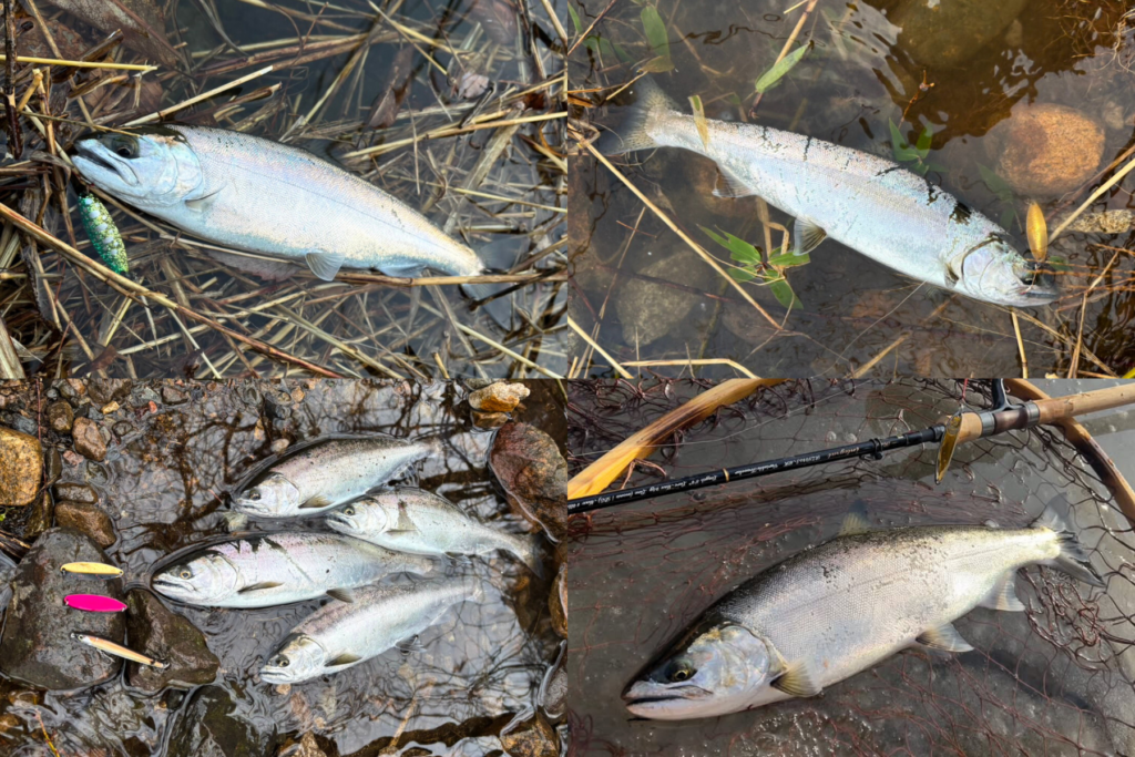 シラメ(サクラマスやサツキマスの幼魚)も例年より数なかったですが、中型サイズ(35〜40cm未満)の魚影が異常に薄く、今年のスクール中には中型サイズの釣果がありませんでした。