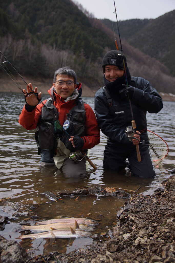 お父様は還暦までにレイクトラウトを釣ることを目標に一念発起、湖2年目。息子様は2年前に釣りにハマり、ボートシーバスなどがメインで湖初挑戦とのことでした。