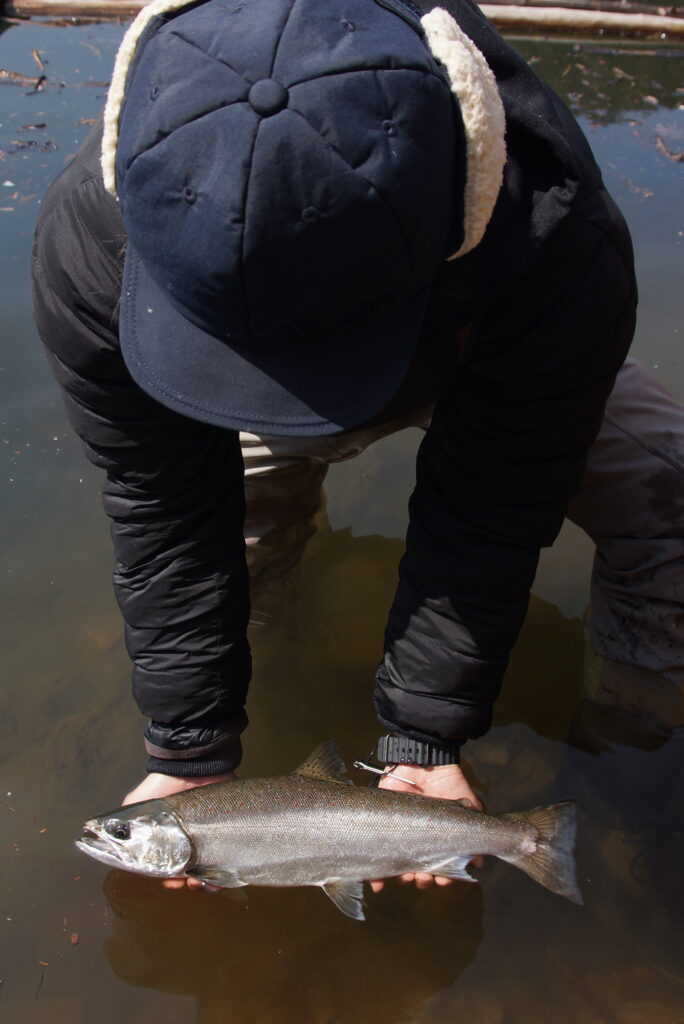 現場でご購入いただいたサブライムスプーン9gにて、この日の最大魚となる46cmのサツキマス。