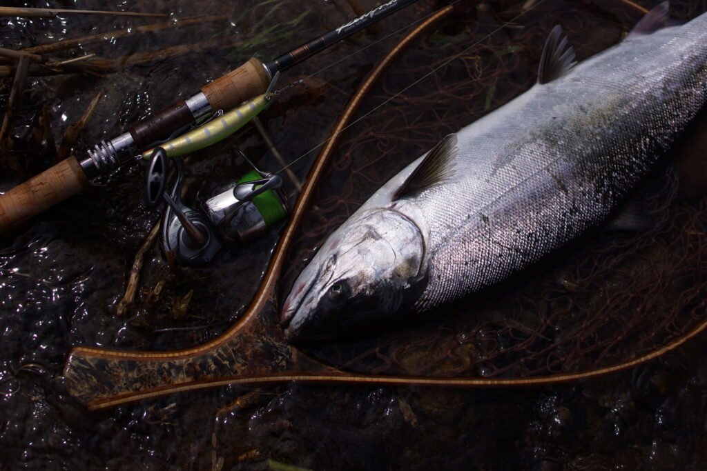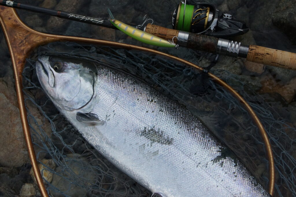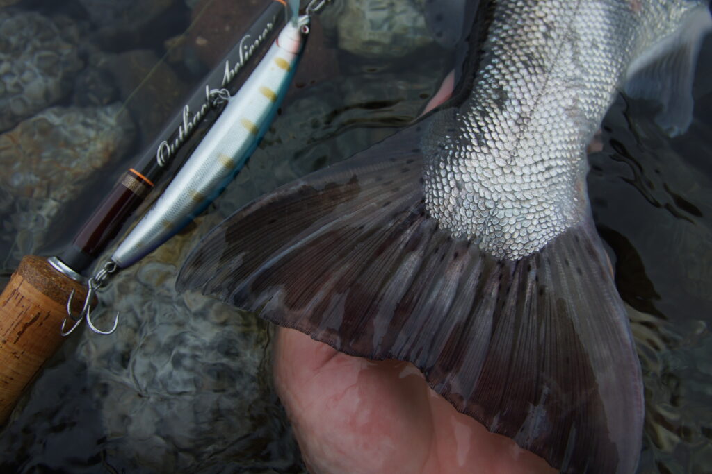 基本的にはサクラマスでの使用をメインに考えて設計しておりますが、本流の大ニジマスが大きなミノーに反応するタイミングにも有効であることが分かっています。(レインボーハンターのスタッフ大森の調査による)