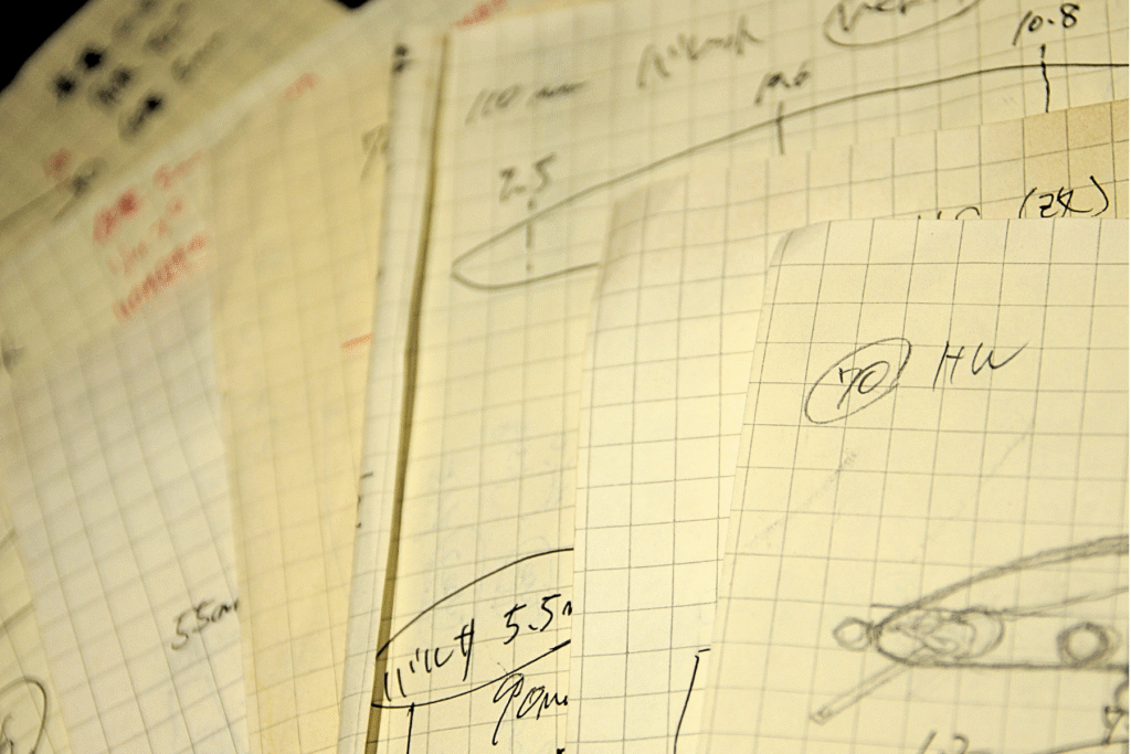 試作ミノーは常にレシピのようなメモを残しておきます。バレットはこれまでに一番多くの試作品を作ったモデルの一つです。