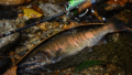 大きなプールの底で、明らかにド派手なピンクの魚体が鎮座しているが、水深のあるところでは流れも効いていないのでキャストしても無駄に警戒されるだけだ。