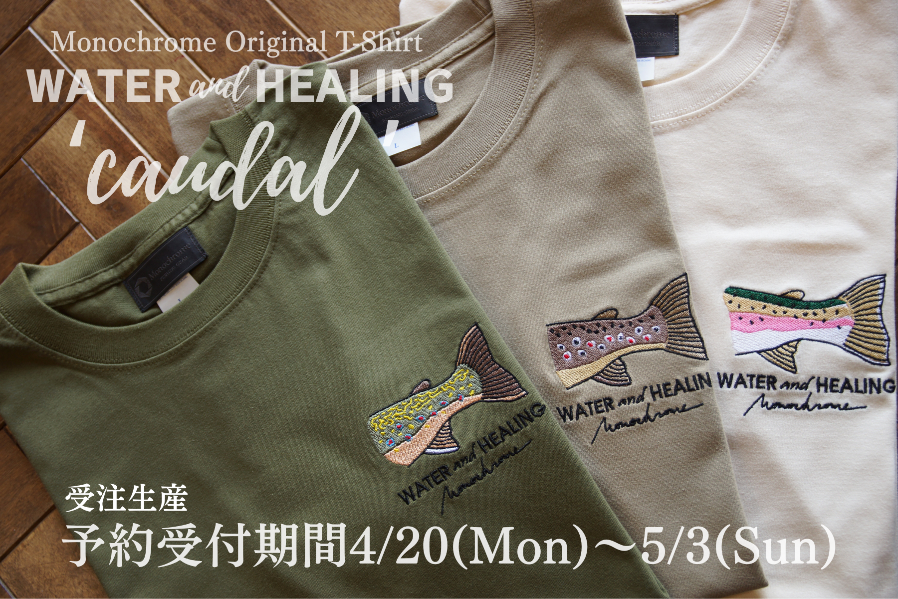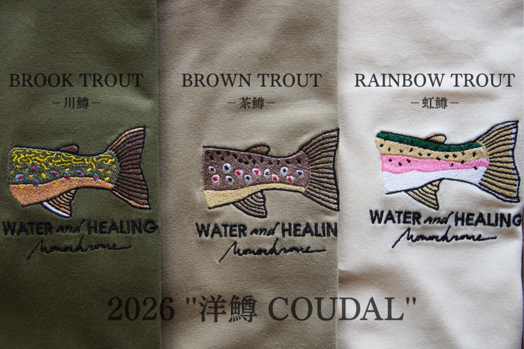 モノクロームが提案する、マイナスイオンたっぷりの渓流で癒されたいトラウティストに向けたアイテムとして「WATER and HEALING ”caudal”」と名付けました。