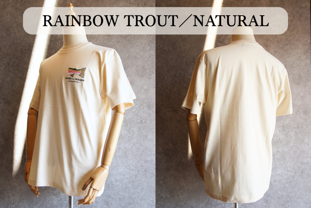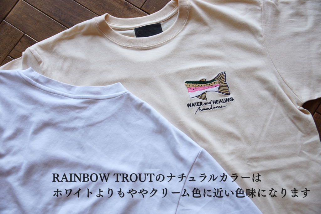 トラウトの顔ではなく、あえて尾鰭だけを刺繍で施し、絵本に描いたような優しいデザインのTシャツです。