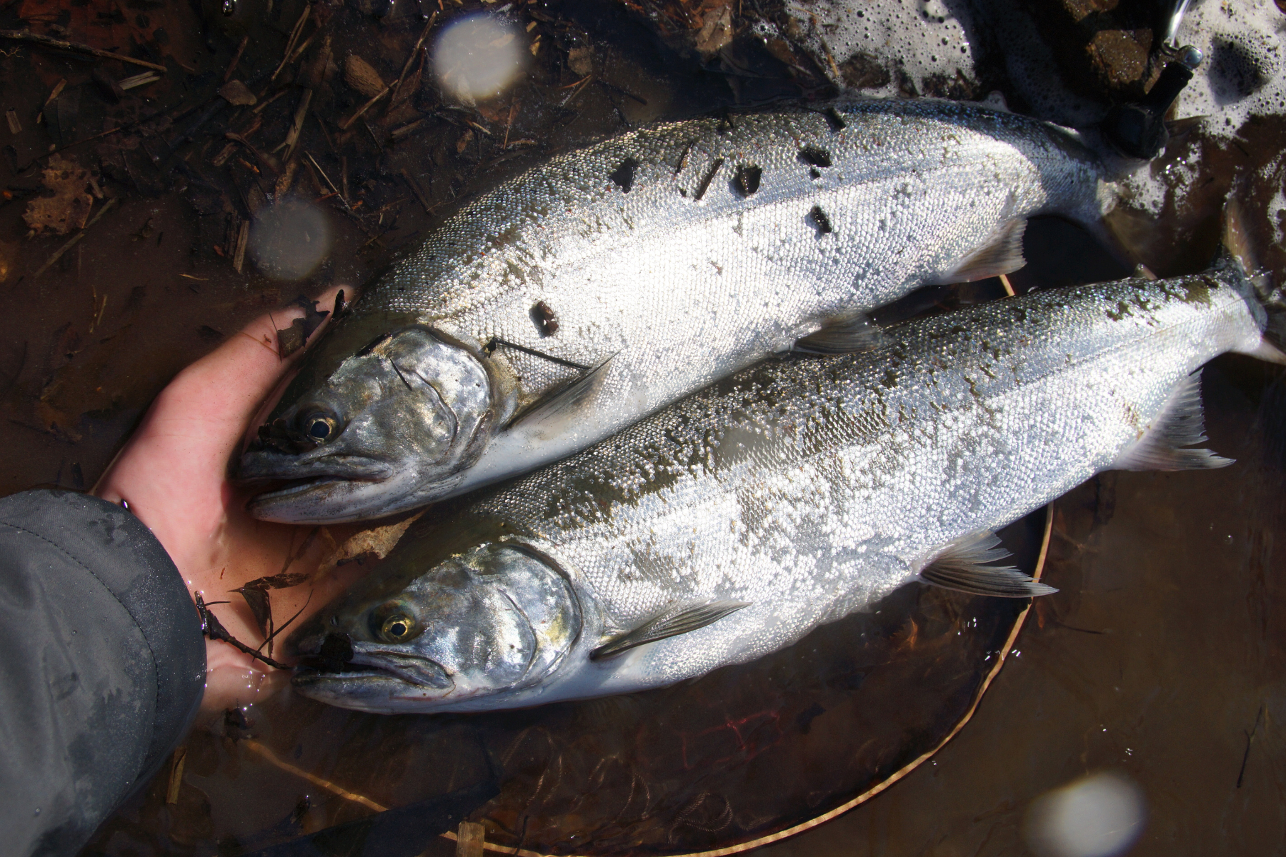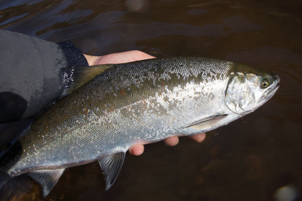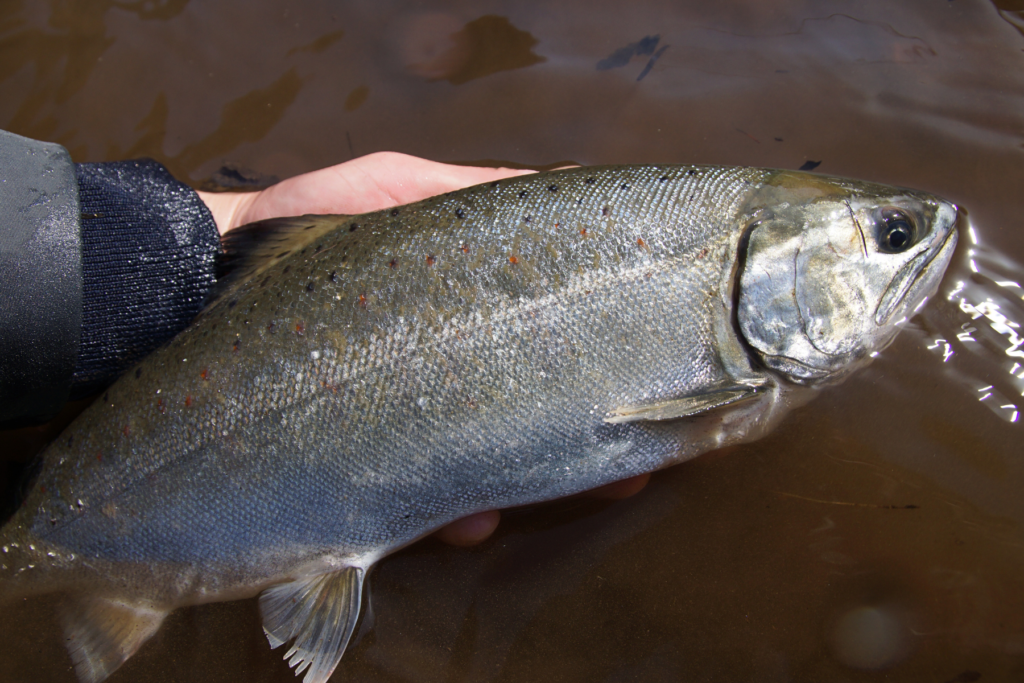 日が登ってきたタイミングでミノーへの反応もよくなってきて、調整中のクロスサイド95SRFでも42cmのサツキマスの釣果があったのが収穫ですかね。