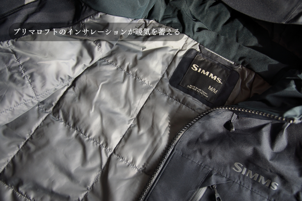 僕も解禁当初のダム湖ではマイナス10℃以下の条件下で釣りをすることもしばしばありますから、バルクレイジャケットに搭載されている暖気を蓄え、冷気を遮断してくれるプリマロフトのインサレーションは非常にありがたいのです。