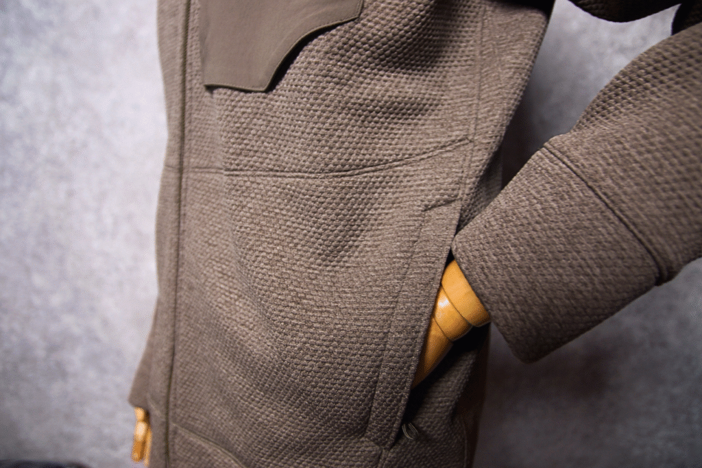 ワッフル状の凸凹としたヘビーウエイトの生地は十分な厚みがあり、アウターとしての高級感も◎。