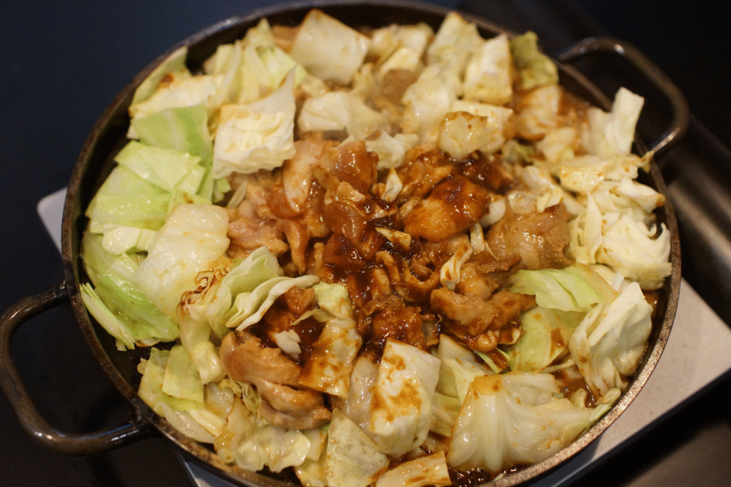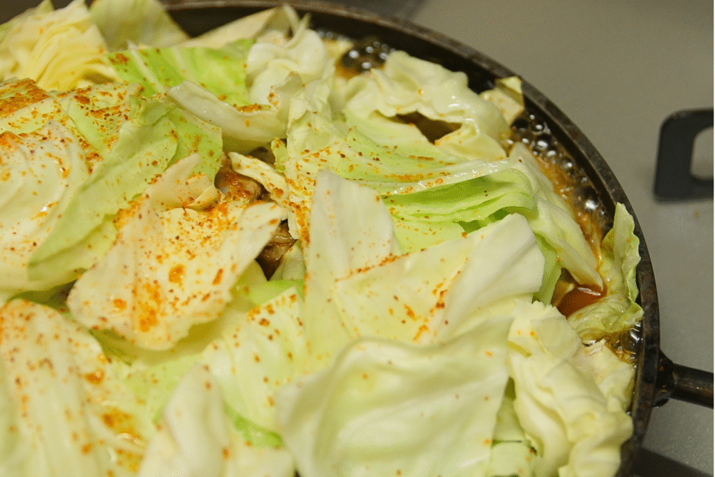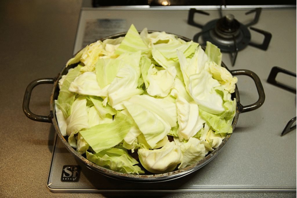 ②キャベツをざく切りにしてけいちゃんの上に盛り付けます。けいちゃんの上にキャベツを盛ることで油はねを抑えることが出来、鶏肉が蒸されてふっくらと仕上がります。
