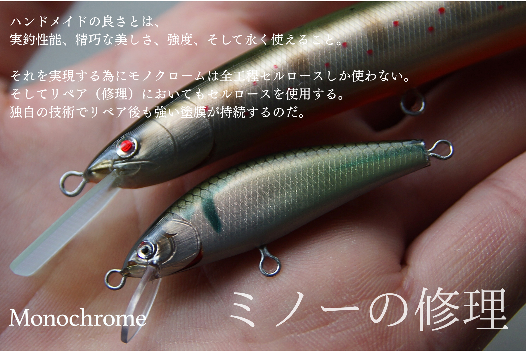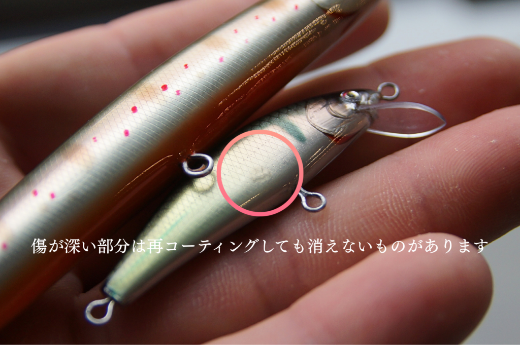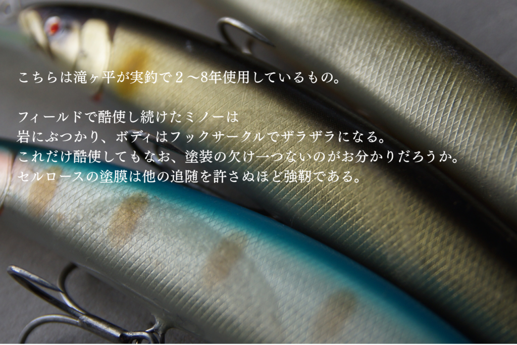リペアには傷んだ塗膜の再コーティング作業が必須となりますが、モノクロームのミノーのリペアにはセルロースによる再コーティングを行っております。