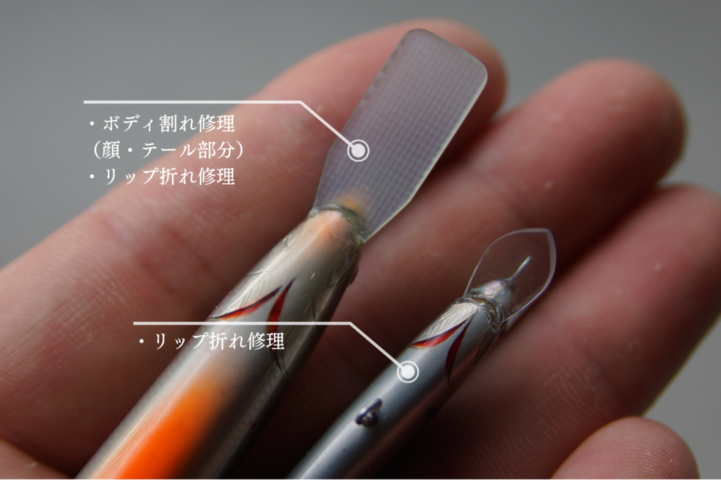 写真は僕が2〜8年間、サクラマスの実釣で使用しているルアー(上)と今回修理が完了したルアー(下)。