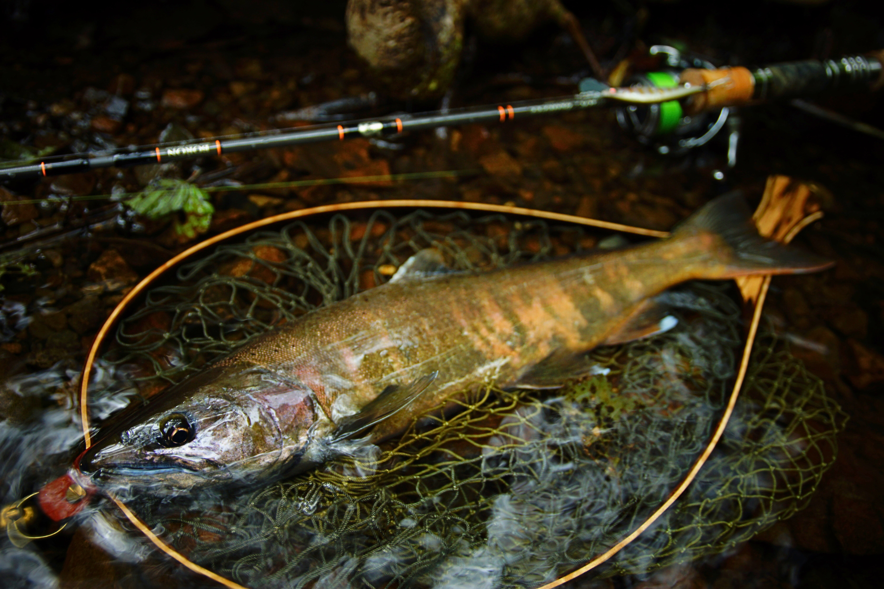 本命もどこかに隠れていそうだな、と白泡へルアーを送り込むこと数回、白泡直下でまさかのブラインドでヒットした雄ヤマメ。
